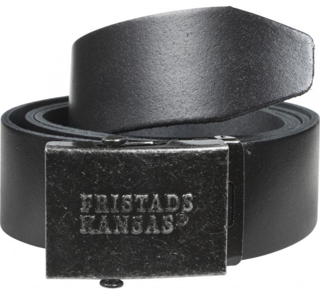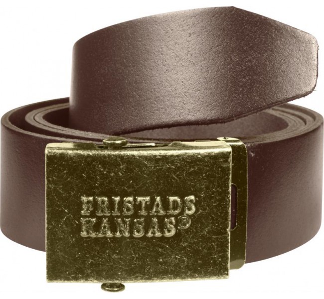 Stevige leren riem / Gesp in antiek messing (riem bruin), antiek zilver (riem zwart) met decoratie aan de randen en Fristads-logo.