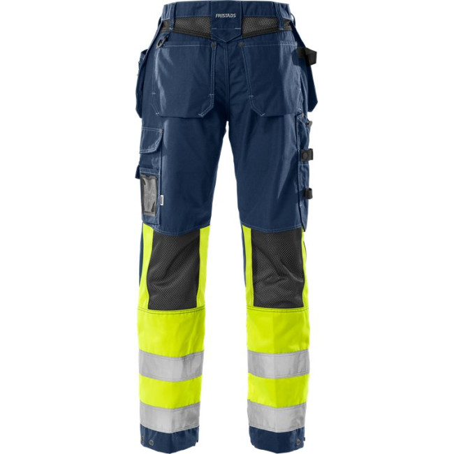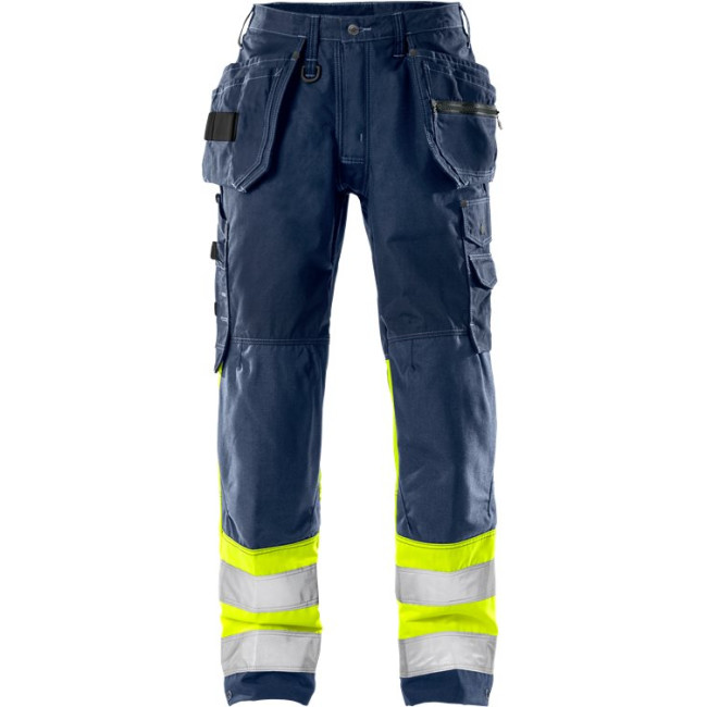 Ventilerend gaasmateriaal op de achterste pas en de knie / 2 loshangende, met CORDURA® verstevigde zakken, 1 zak met rits 1 met 3 kleinere zakken en gereedschapslus / D-ring op de voorste riemlus en op het schouderstuk op de rug / 2 voorzakken / 2 schuine achterzakken / Brede riemlus middenachter / Dubbel verstevigde kruisnaad / Met CORDURA® verstevigde duimstokzak met pennenhouder, 2 knopen en lussen voor werkmessen. / Multi-functionele beenzak links met telefoonzak, ID-pashouder en grote binnenzak met drukknoopsluiting / Met CORDURA® verstevigde kniezakken met opening aan de binnenzijde / Kniezakken voor in hoogte verstelbare kniebeschermers / Met CORDURA® verstevigde broekspijpuiteinden, verstelbaar met drukknoopsluiting / De zakken zijn op de kwetsbare punten verstevigd met klinknagels. / Goedgekeurd volgens EN 14404 in combinatie met kniebeschermers 124292 en EN ISO 20471 klasse 1 / OEKO-TEX® gecertificeerd.