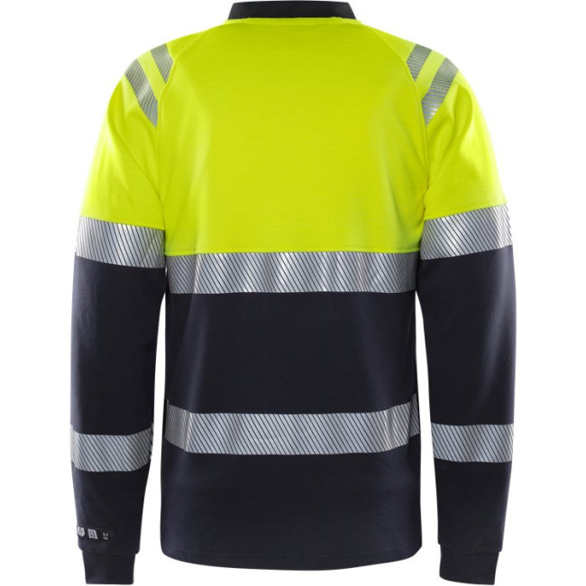 Col en V / Manches raglan / Encolure et poignets en tricot côtelé / Approuvé selon la norme EN 61482-1-2 classe 1, EN 61482-1-1 ELIM : 9,5 cal/cm², EBT: 11,5 cal/cm², EN ISO 11612 A1 A2 B1 C1 F1, EN 1149-5 et EN ISO 20471 classe 1 / Approuvé après 25 lavages / Testé pour la location de linge selon la norme ISO 15797 / OEKO-TEX® Certifié.
