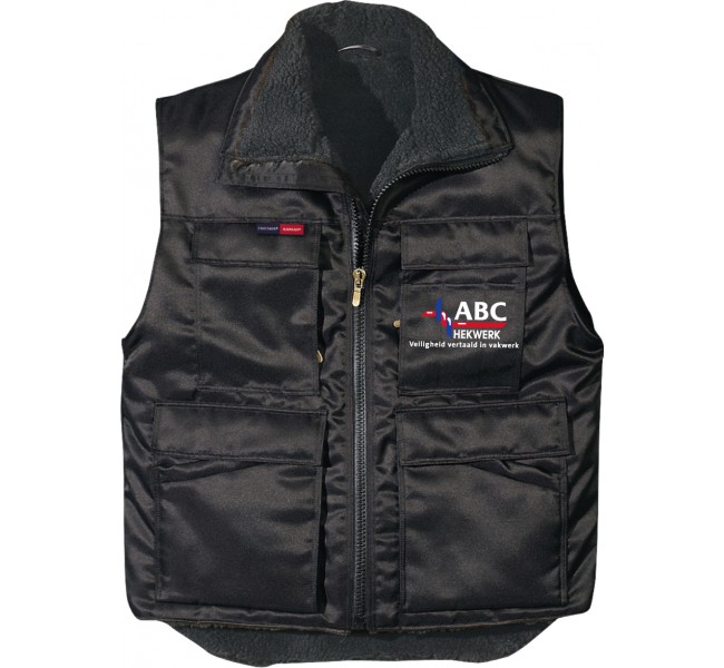 Polydex®. vuil-, olie- en waterafstotend- Warme bodywarmer met teddyvoering- Rits tot bovenzijde kraag, verlengd rugpand- 2 borstzakken, 1 met drie zakken voor gereedschap en pennen- 2 verborgen borstzakken met- 2 zakken voor het verwarmen van de handen- verborgen ID-kaart zakje - lusje waardoor het kabeltje van een headset van een mobiele telefoon kan worden geleid - binnenzak