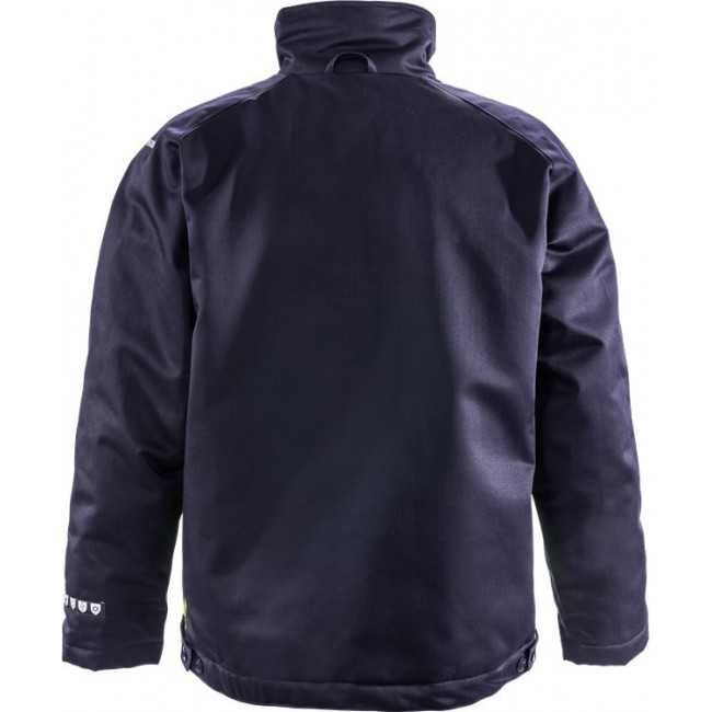 Vuil-. olie- en waterafstotende stof . Volledig gevoerd . Verdekte ritssluiting en knopen aan de voorzijde tot bovenin kraag . 2 borstzakken met klep en verdekte drukknooppsluiting . 2 binnenzakken met knoop. rechts met telefoonzakje met klittenbandsluiting en opening voor headset . 2 voorzakken met klep en verdekte drukknoopsluiting . Elastische binnenmanchetten . Verstelbare taille door middel van knopen . Verlengd rugpand . Goedgekeurd volgens EN 61482-1-2 klasse 2. EN ISO 11611 A1 klasse 1 en EN ISO 11612 A1 B1 C1 en EN 1149-5 . . OEKO-TEXR gecertificeerd.