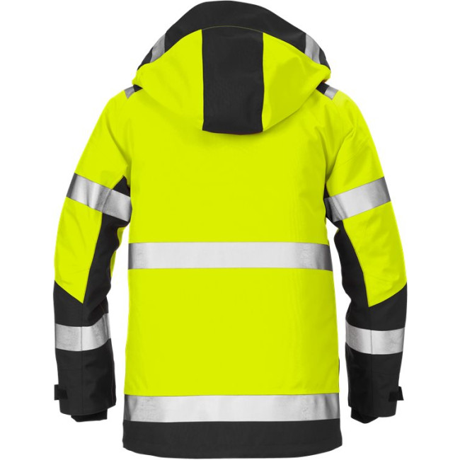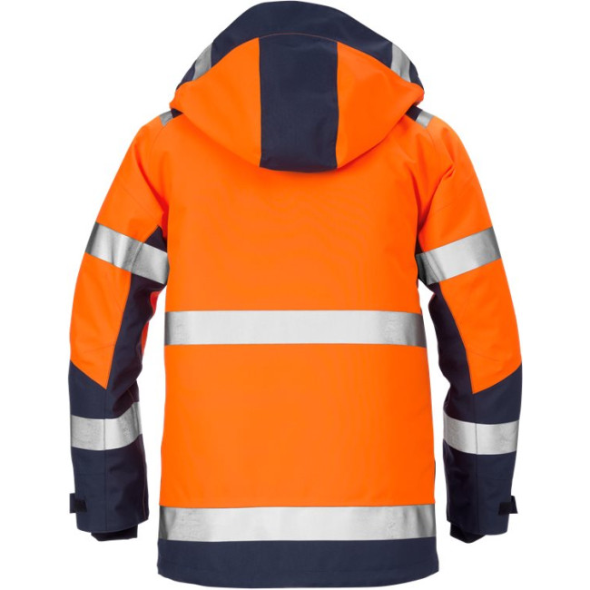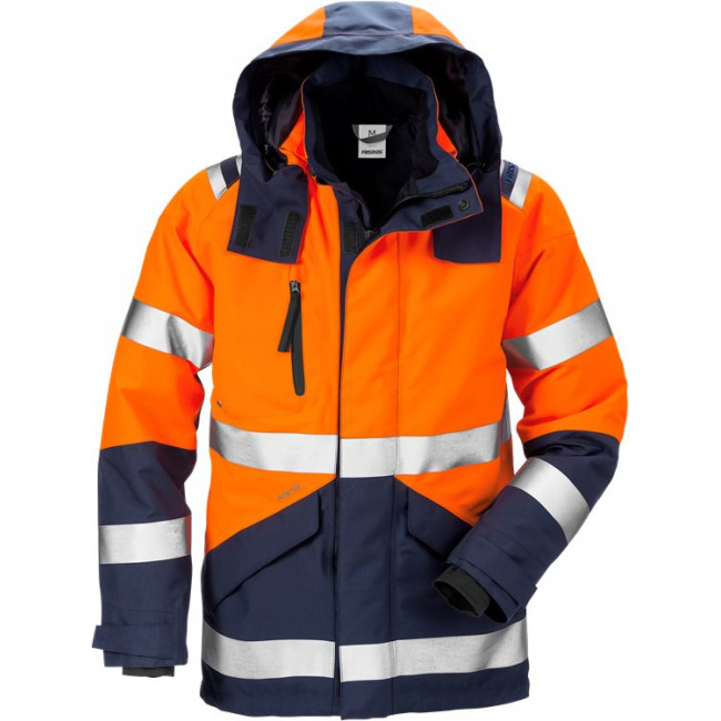 2-laags GORE-TEX-materiaal, ademend, wind- en waterdicht / Afneembare gevoerde capuchon, met verstelkoord / Kraag met fleecevoering / Reflecterende details op de schouders / Sluiting voorzijde met rits tot aan de bovenkant van de kraag en klittenbandsluiting / Borstzak met waterafstotende rits, D-ring aan de binnenkant / Zak met A4-formaat met telefoonzak binnenin die van buitenaf toegankelijk is / 2 voorzakken met klep en waterafstotende rits / Binnenzak met rits / Bedrukkersrits in voering voor eenvoudig borduren en bedrukken / Verstelbare onderzijde met verstelkoord / Verstelbare breedte aan mouwuiteinde / Elastische binnenmanchetten met duimlus / Waterkolom > 10.000 mm / ePTFE membraan / Ademend vermogen RET < 6 / Goedgekeurd volgens EN ISO 20471 klasse 2 - maat XS en klasse 3 - maat S-3XL, EN 343 3/3 / Goedgekeurd na 25 wasbeurten / OEKO-TEX® gecertificeerd / Getest voor industrieel wassen volgens ISO 15797.