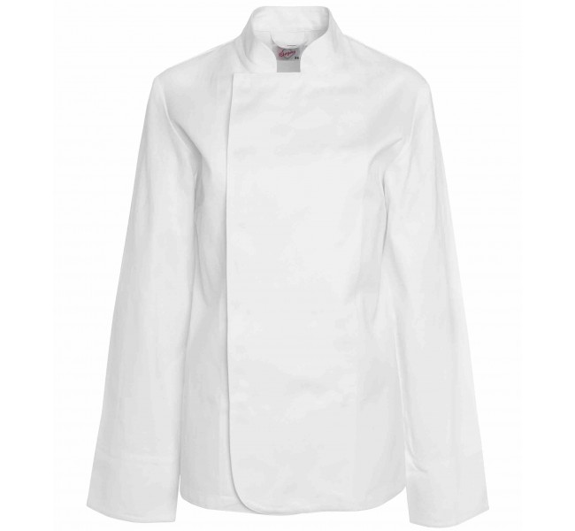 Klassiek model met borstplooi, iets getailleerd. Blinde drukknoopsluiting, lus in de kraag. Naden aan de rugzijde