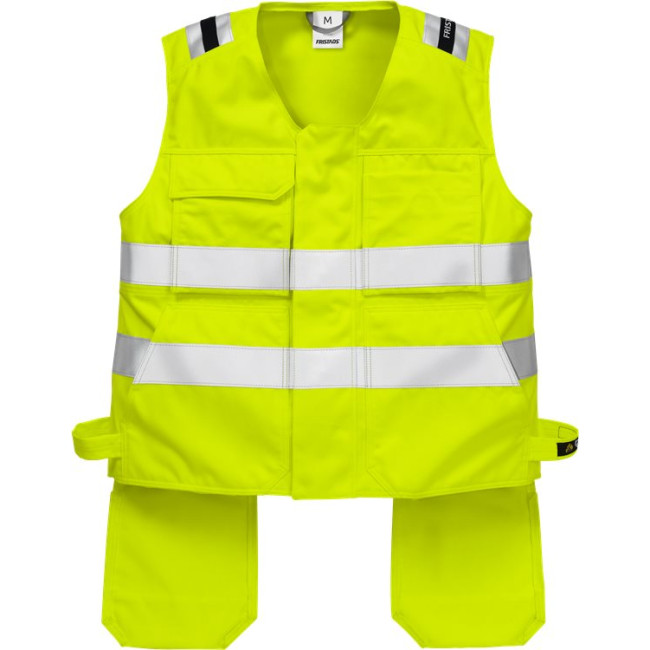 High vis gecertificeerd vest met inherente vlambescherming, aangepast voor ATEX-omgevingen zonder metalen details. Goedgekeurd voor industrieel wassen.