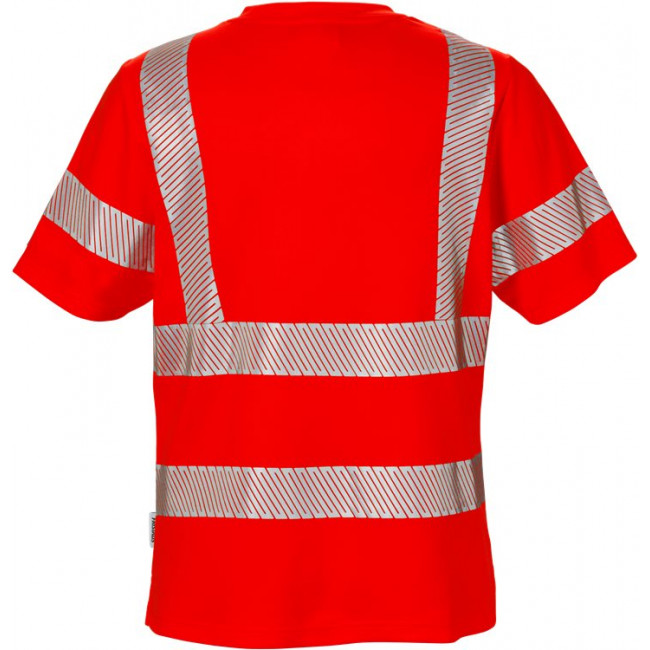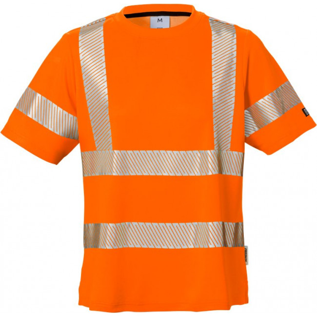 T-shirt met hoge zichtbaarheid en vrouwelijke pasvorm met stretch-reflectietape voor extra bewegingsvrijheid. Gemaakt van een zacht en comfortabel materiaal met katoen aan de binnenkant. Voert transpiratie af, droogt snel en biedt UV-bescherming.