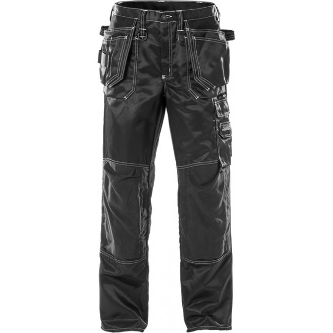 Polydex® / Geruwd aan de binnenzijde / 2 weg te steken, loshangende zakken, 1 met extra zak, 1 met 3 kleine zakjes en lussen voor gereedschap / 2 ruime voor- en achterzakken / 2 hamerlussen waarvan 1 verstelbaar / Duimstokzak met pennenzak en knoop en lus voor werkmes / Dijbeenzak met klep, telefoonzak met klep en klittenbandsluiting en verborgen ID-pashouder / Met CORDURA® verstevigde kniezakken met opening aan de buitenkant / Kniezakken voor in hoogte verstelbare kniebeschermers / Goedgekeurd volgens EN 14404 samen met kniestukken 124292 / OEKO-TEX® gecertificeerd.
