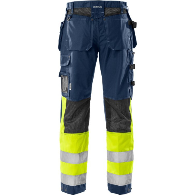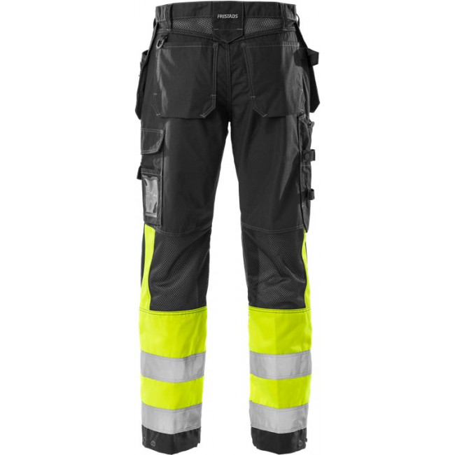 Werkbroek met hoge zichtbaarheid van stevig en licht ripstopmateriaal, met ventilatiepanelen aan de achterkant en achter de knieën voor extra comfort bij werk in warme omgevingen.