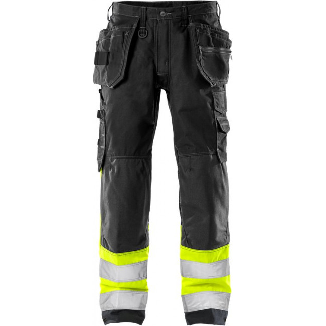 Gaasmateriaal aan de achterkant en in de knieholtes /2 loshangende zakken verstevigd met CORDURA®, 1 met rits, 1 met 3 kleinere zakken en gereedschapslus / 2 zakken aan de voorkant / 2 schuine achterzakken / Rechterbeenzak met pennenzakje, 2 knopen en lus voor werkmessen en met CORDURA® verstevigde duimstokzak / Linker multifunctionele beenzak met telefoonzakje, ID-pas houderen grote binnenzak met drukknoopsluiting / Met CORDURA® verstevigde kniezakken met opening aan de binnenzijde voor in hoogte verstelbare kniebeschermers / Met CORDURA® verstevigde uiteinden van de broekspijpen met drukknopen / Zakken verstevigd met metalen klinknagels op de kritieke punten / D-ring aan de voorste riemlus / Brede riemlus aan achterzijde / Goedgekeurd volgens EN 14404 samen met kniebeschermers 124292 en EN ISO 20471 klasse 1 / OEKO-TEX® gecertificeerd.