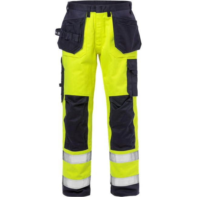 Gecertificeerde vlambeschermende broek met hoge zichtbaarheid gemaakt van duurzaam en comfortabel vlamvertragend materiaal. Werkbroekmodel met donkere kleuren op plekken die eerder vuil worden en kniezakken van vlamvertragend CORDURA®. Getest voor 50 x industrieel wassen.