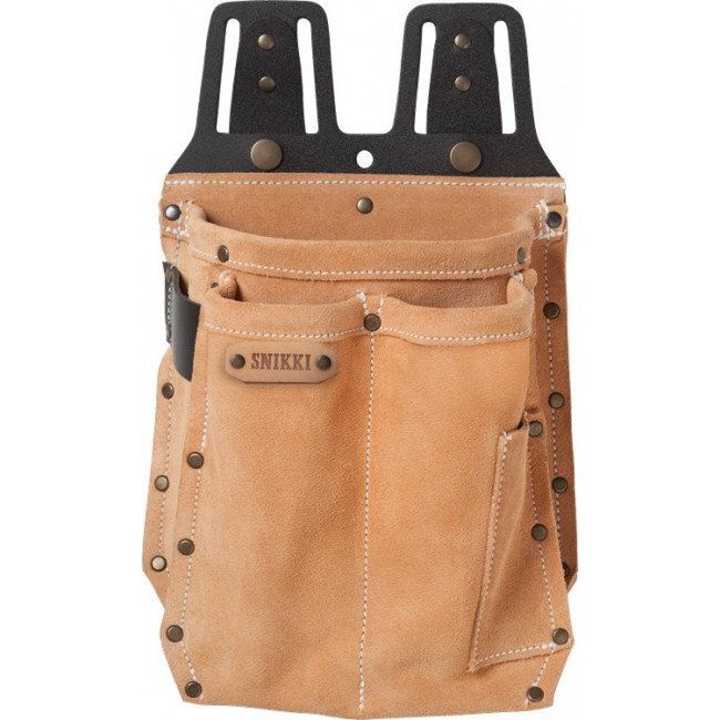Zware kwaliteit leer / Voor werknemers in de staalindustrie, monteurs etc. / Grote zak H 190 x BR 160 x D 80 mm / Kleine zakken H 190 x BR 60 x D 30 mm en H 100 x BR 40 x D 50 mm / 1 zak voor spijkers, schroeven, binddraad / 3 gereedschapszakken / Houder voor werkmes / Met klinknagels verstevigd / Quick-grip.