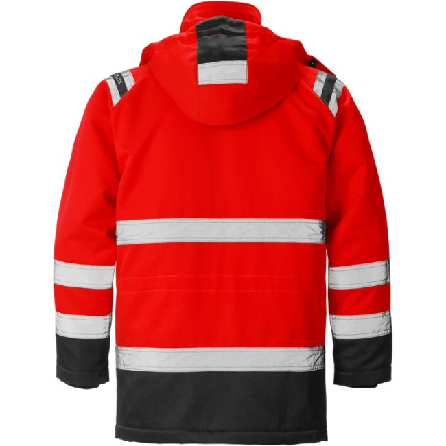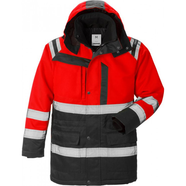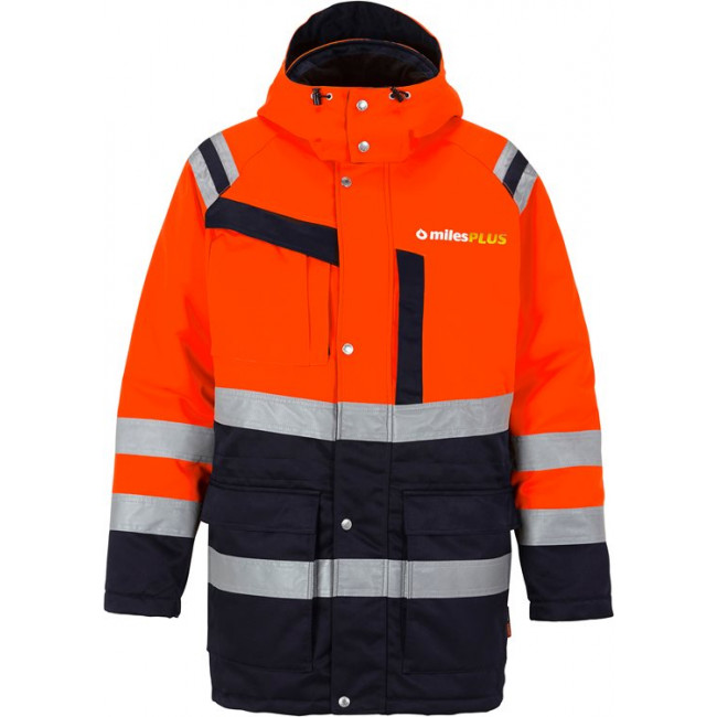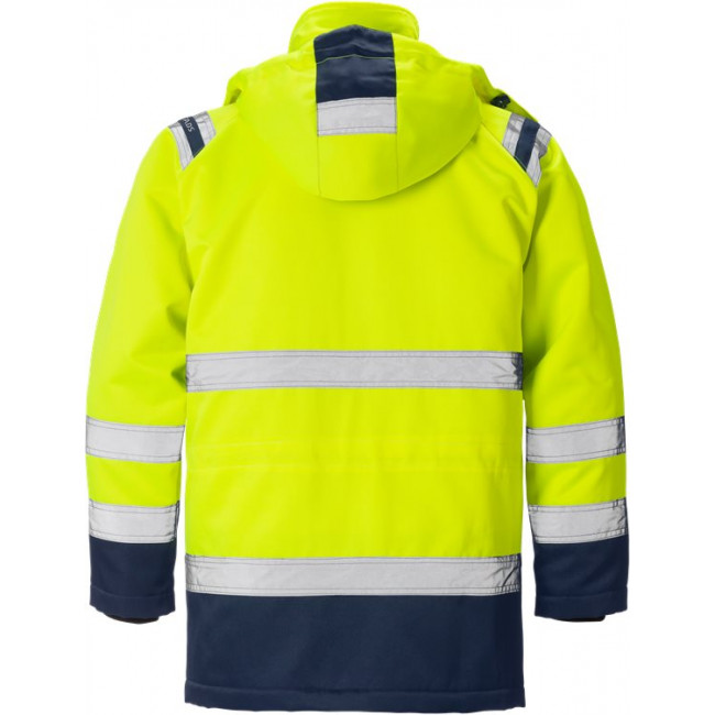 Winddichte winterparka met hoge zichtbaarheid, van vuil-, olie- en waterafstotend materiaal met uitneembare binnenvoering. Goedgekeurd voor industrieel wassen op 60 graden.