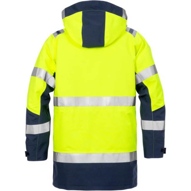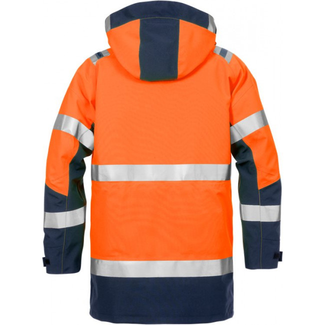 2-laags GORE-TEX-materiaal, ademend, wind- en waterdicht / Uitneembare voering met binnenzak met knoop / Afneembare gevoerde capuchon, verstelbaar met trekkoord / Met fleece gevoerde kraag / Reflecterend detail op schouders / Sluiting voorzijde met rits tot aan de bovenkant van de kraag en klittenbandsluiting / Borstzak met waterafstotende rits, D-ring aan de binnenkant / Grote zak met van buitenaf toegankelijke binnenzak voor mobiele telefoon / 2 voorzakken met klep, 1 met klittenbandsluiting en 1 met knoop / 2 met fleece gevoerde zakken voor het warmen van de handen / Manchetten in de mouwen met duimlus / Binnenzak met knoop / Rits in voering voor eenvoudig borduren en bedrukken / Waterkolom > 10.000 mm / ePTFE membraan / Ademend vermogen RET < 6 / Goedgekeurd volgens EN ISO 20471 klasse 3 en EN 343 3/3 en EN 342 / Goedgekeurd na 25 wasbeurten / OEKO-TEX® gecertificeerd / Getest voor industrieel wassen volgens ISO 15797.