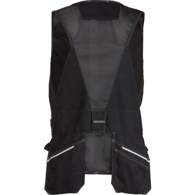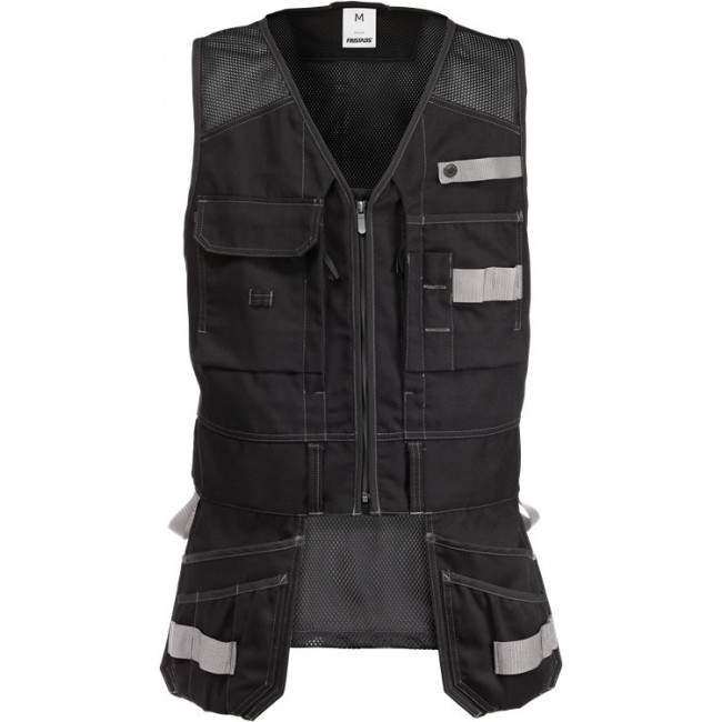 Klassiek vest met ventilerend gaas op de rug en veel functionele zakken. De breedte is verstelbaar met een extra rits aan de voorkant, zodat het over een gevoerde jas kan worden gedragen.