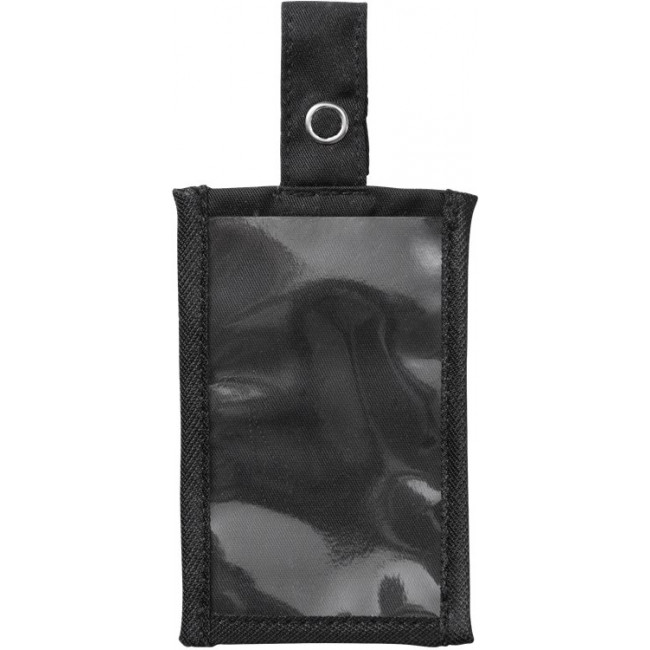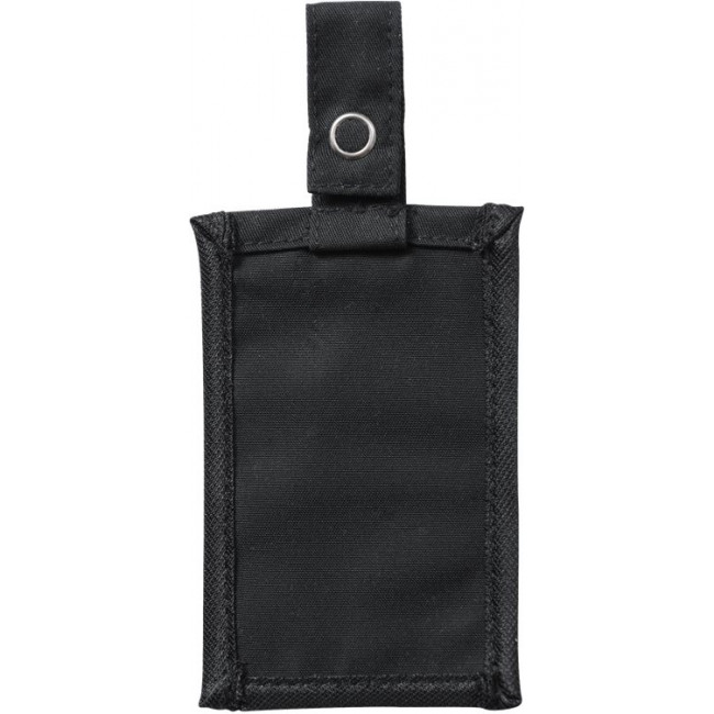 ID-pashouder van zacht materiaal met drukknoop waarmee hij gemakkelijk van het ene naar het andere kledingstuk kan worden overgebracht.