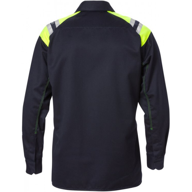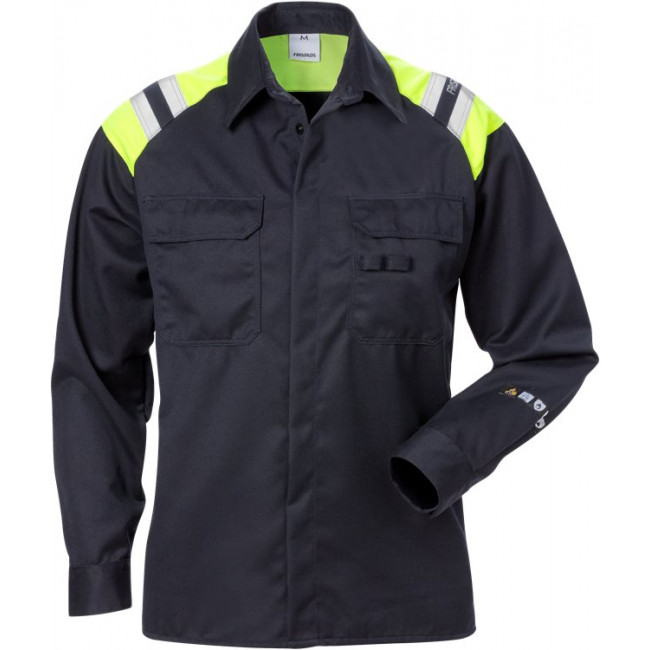 Reflecterende details op de schouders / Verdekte drukknoopsluiting onder sluitklep op het voorpand / Manchetten met verdekte drukknoopsluiting / 2 borstzakken met klep en verdekte drukknoopsluiting, 1 met pennenlussen / Verlengd rugpand / Metaalvrij kledingstuk / Goedgekeurd volgens EN 61482-1-2 klasse 1, EN 61482-1-1 EBT: 9,9 cal/cm² HAF: 78,0% (zie tabel voor vlamboog gecertificeerde kledingcombinaties volgens EN 61482-1-2 klasse 2 en open arc volgens EN 61482-1-1), EN ISO 11612 A1 A2 B1 C1 F1, EN 1149-5 en EN 13034 type PB [6] / Getest voor industrieel wassen volgens ISO 15797 / OEKO-TEX® gecertificeerd.